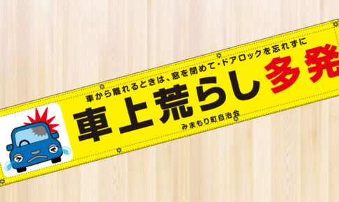 防犯横断幕 街の防犯対策に、通学路などにも 自治体・企業名など名入れ無料の防犯横断幕。車上荒らし注意を促す横断幕です。駐車場などに掲げて注意喚起を呼びかけるデザインです。 横断幕 料金表 【税込価格】 通常…